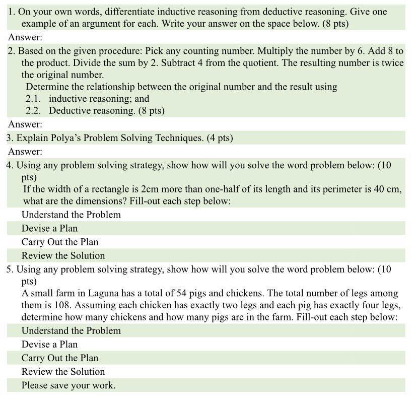 Inductive and deductive reasoning math worksheets. › maths › mathematical-reasoningMathematical Reasoning - Types of Maths Logical ... - VEDANTU a. Inductive Reasoning. This involves looking for a pattern in a given set of problem statements and generalising. For instance, a student may use inductive reasoning when looking at a set of different shapes, such as rectangles, rhombuses and parallelograms. Further, he/she might try to spot the similarities and differences, and figure what is ... study.com › learn › lessonDeductive Argument: Examples | What is Deductive Argument ... Feb 04, 2022 · Deductive arguments are developed through deductive reasoning. Conversely, an inductive argument is an argument that arrives at a conclusion that is logically likely to be accurate, but is not ... › reasoning-geometryReasoning in Geometry (solutions, examples, worksheets ... Inductive Reasoning Inductive reasoning is the process of observing, recognizing patterns and making conjectures about the observed patterns. Inductive reasoning is used commonly outside of the Geometry classroom; for example, if you touch a hot pan and burn yourself, you realize that touching another hot pan would produce a similar (undesired ... study.com › academy › lessonInductive & Deductive Reasoning in Geometry: Definition & Uses Sep 29, 2021 · Inductive reasoning typically leads to deductive reasoning, the process of reaching conclusions based on previously known facts. The conclusions reached by this type of reasoning are valid and can ...